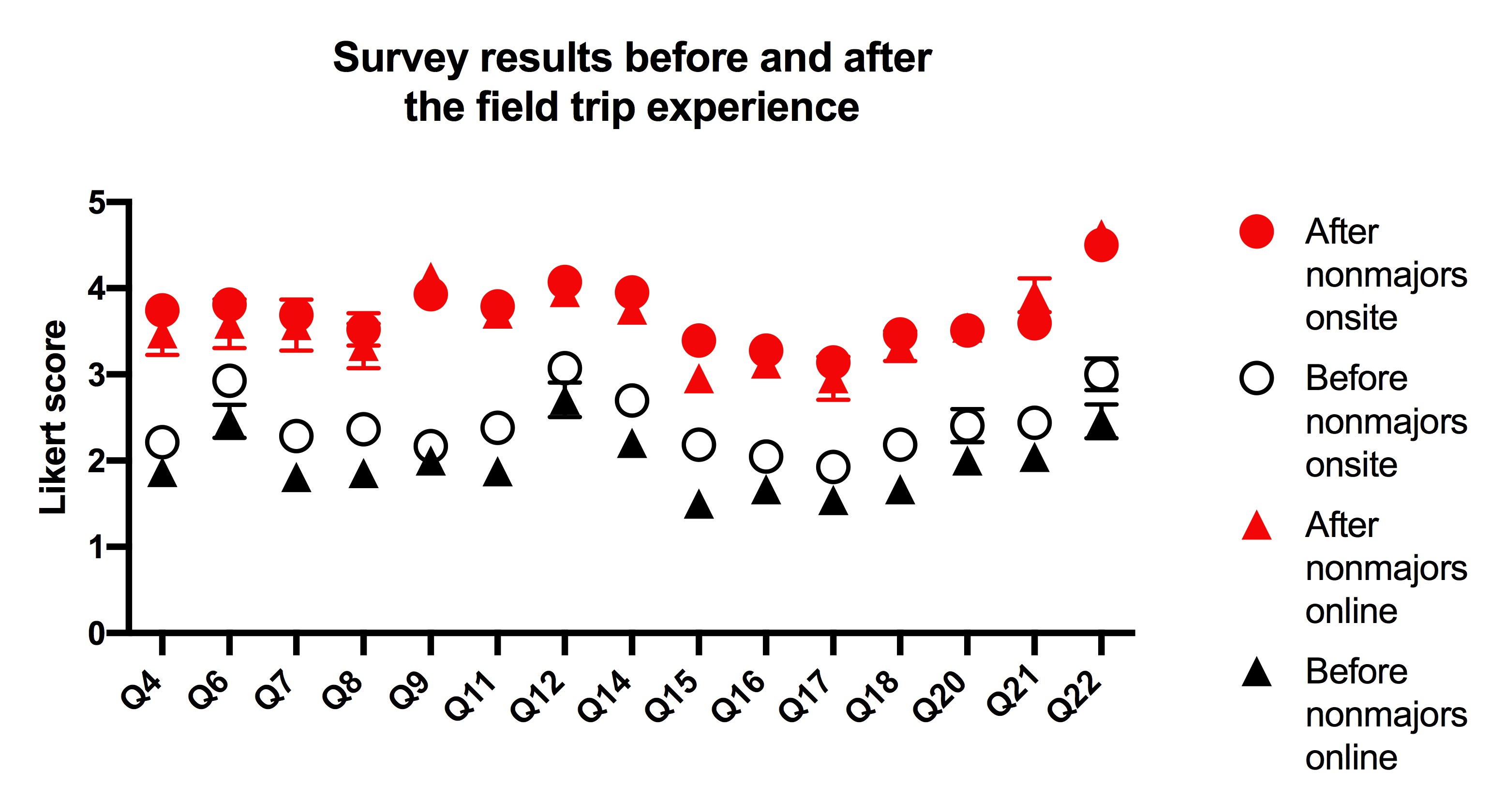 Comparison of survey scores of online vs onsite students, before and after the experience.